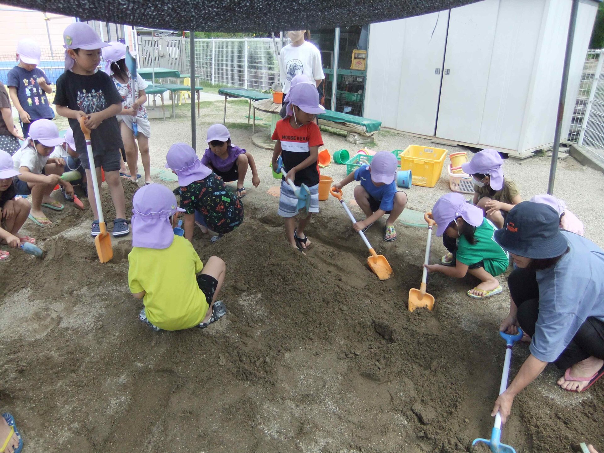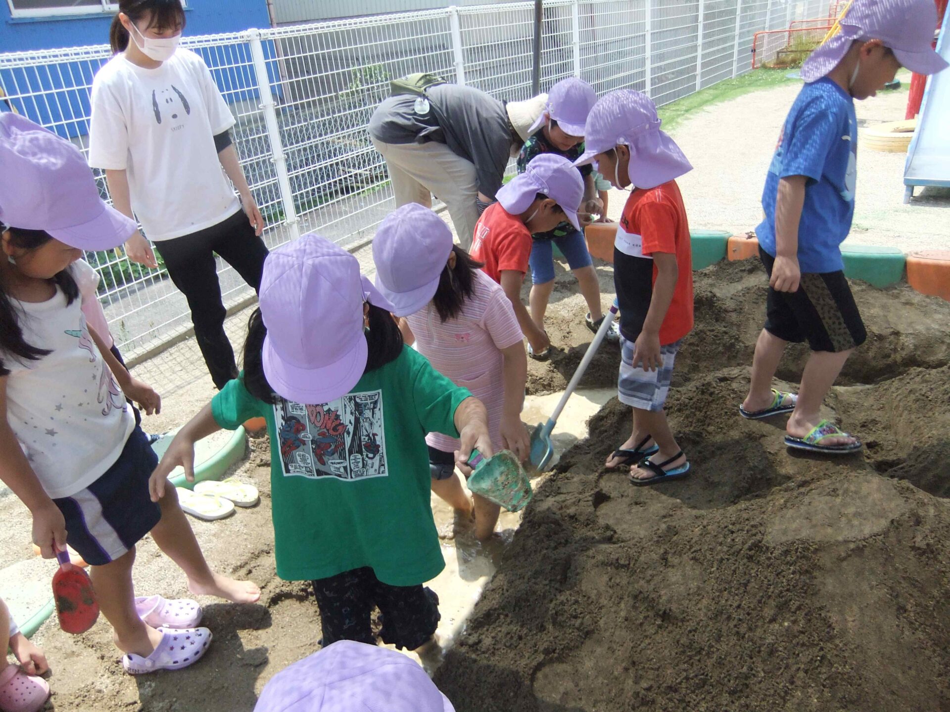 はじめに、みんなで協力しながら水路を掘っていきます。「どれくらい、ほったらいいかなあ」「ここと、ここをつなげよう」「もっと、ふかいほうがいいんじゃない」など、それぞれが考えながら相談しながら進めていました。