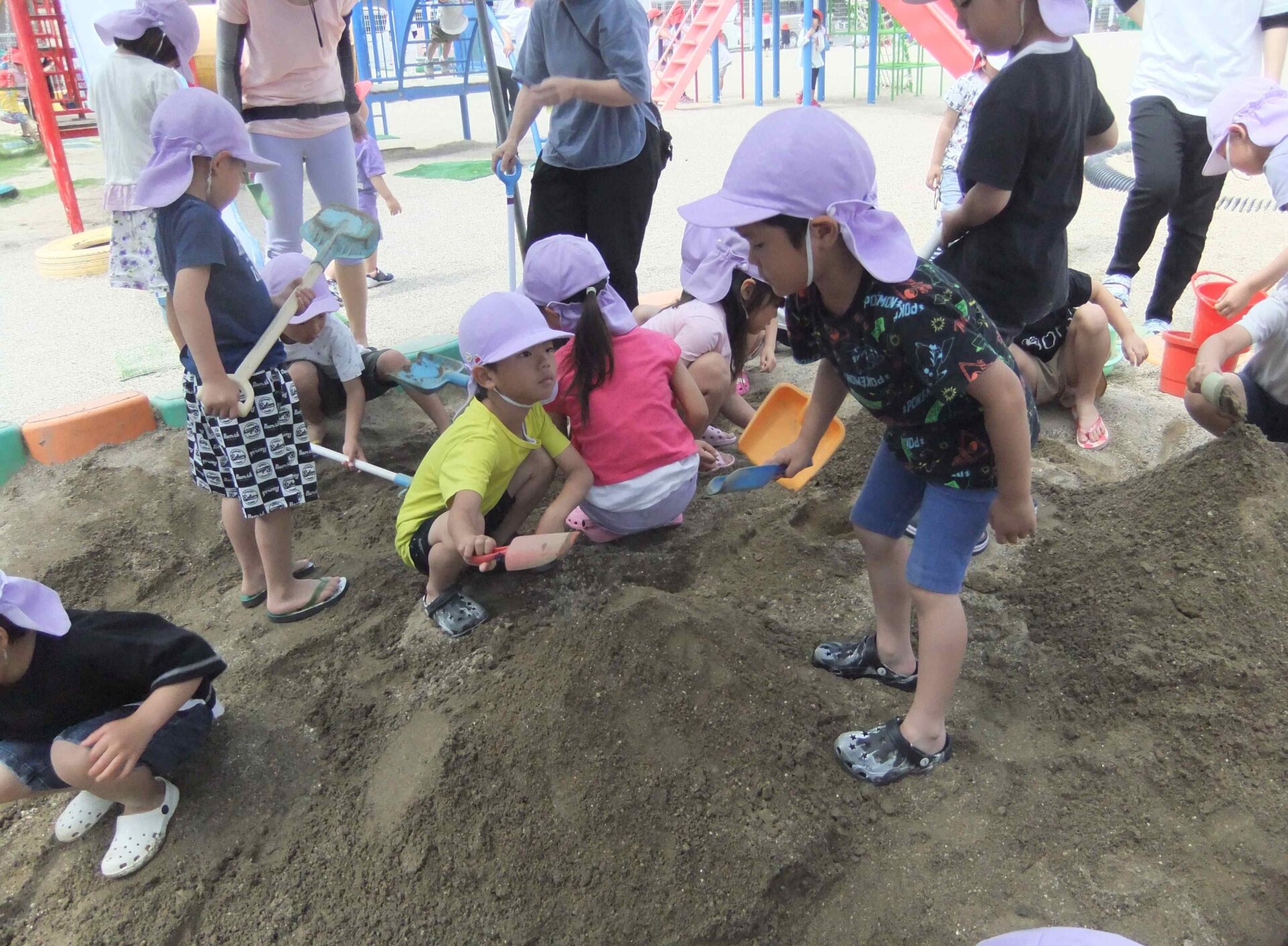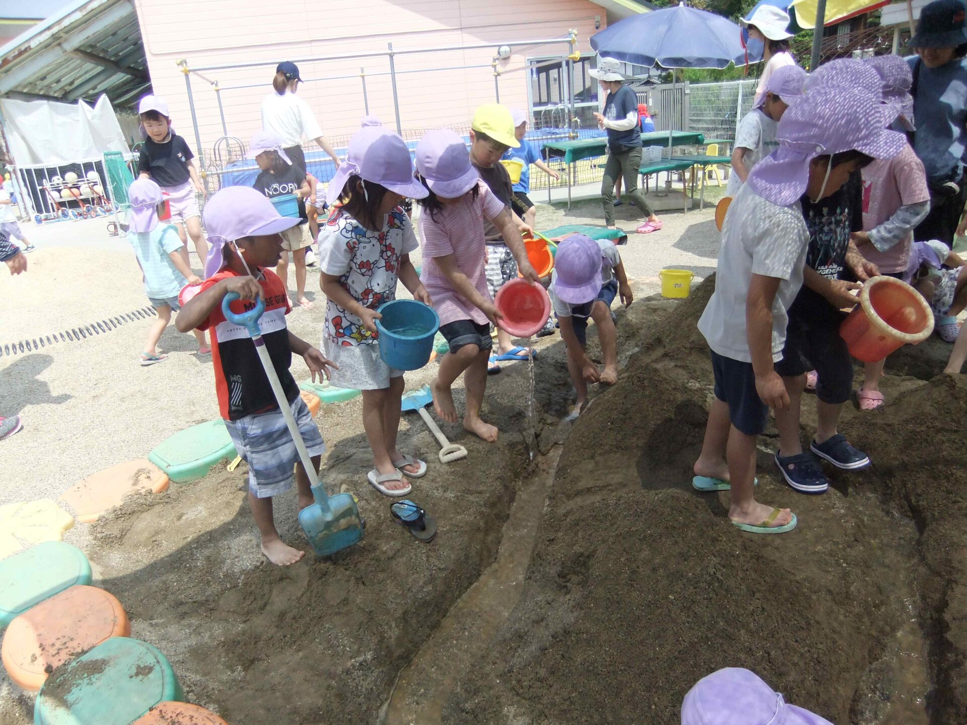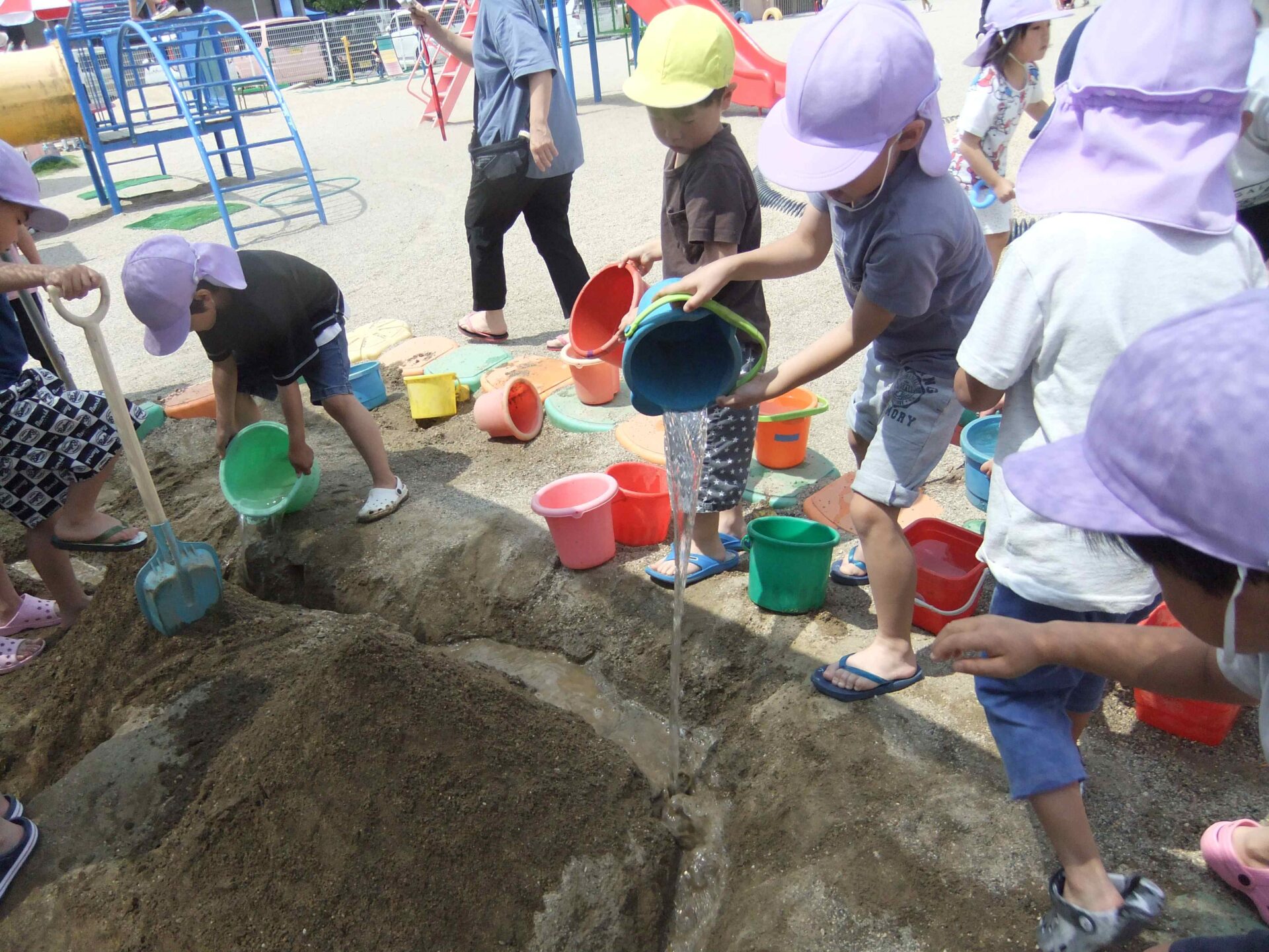 水路が掘れたら、水を汲んできてどんどん流し込みます。「わあ、ながれた!ながれた!」「すごい、すごい」「もっとたくさんいれよう」どの子も目をキラキラと輝かせています。