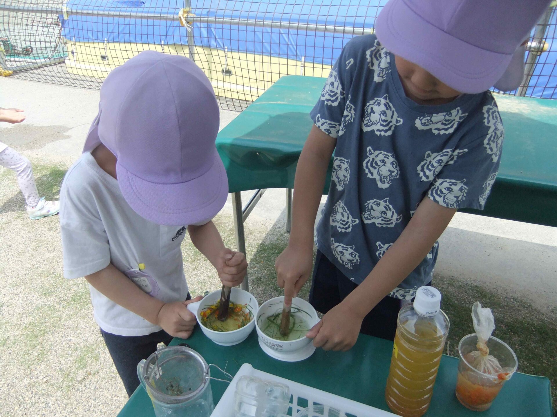 どろんこ遊びができない友だちは、色水遊びを楽しみました。「こうすると、色が出るって〇〇くんがおしえてくれた」と変化する水の色を楽しんでいました。