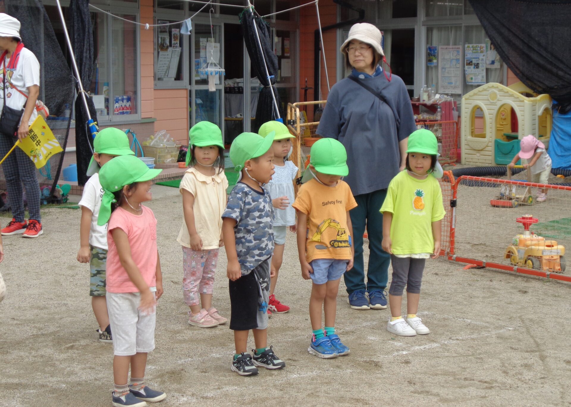 走りたい気持ちが強くて、笛が鳴ると順番関係なく走り出してしまうこともありましたが、少しずつ順番を守ったり「よーい」で構えたりと、上手になってきました。