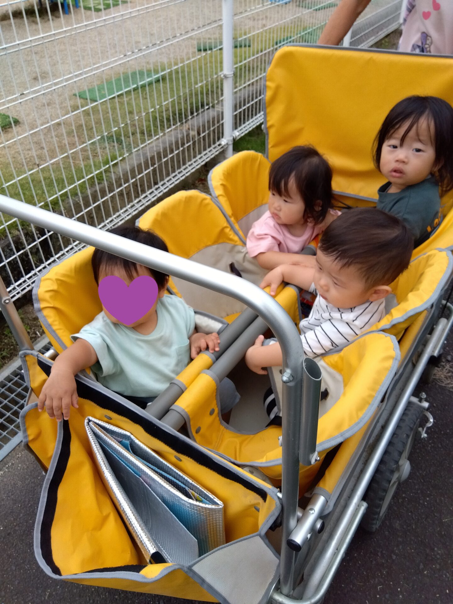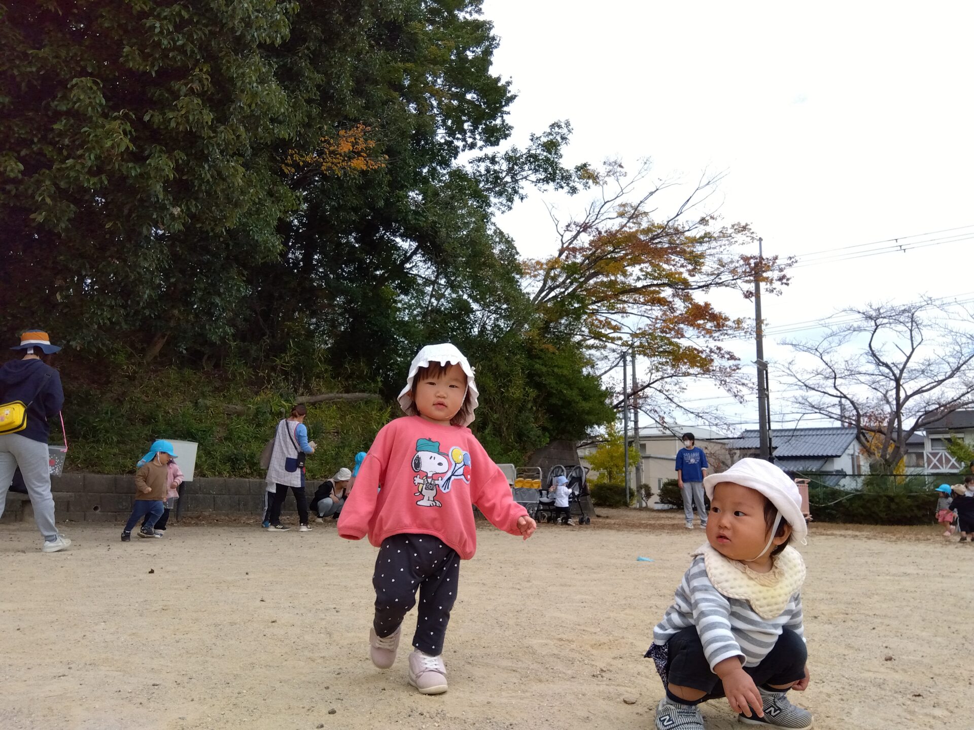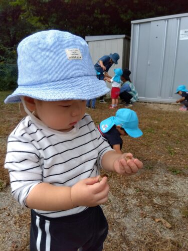 最近では、0.1.2歳児で近くの公園まで散歩に出かけ、広いグラウンドを散策したりどんぐりを見つけたりしています。