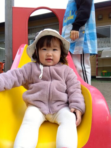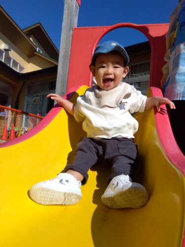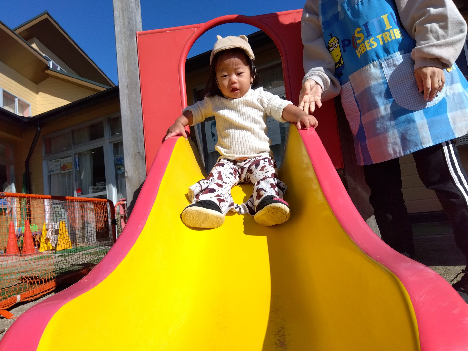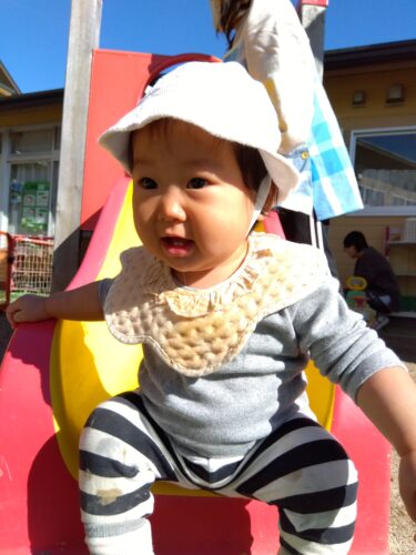 園庭では、砂場や滑り台など思い思いの遊びを見つけ、保育教諭と一緒に楽しく過ごしています。歩けるようになり行動範囲も広がり楽しさが倍増しているようです。