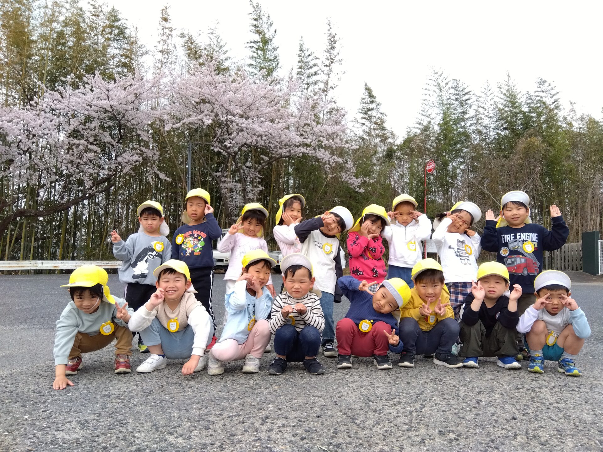 桜の前で初めての集合写真を撮りました。