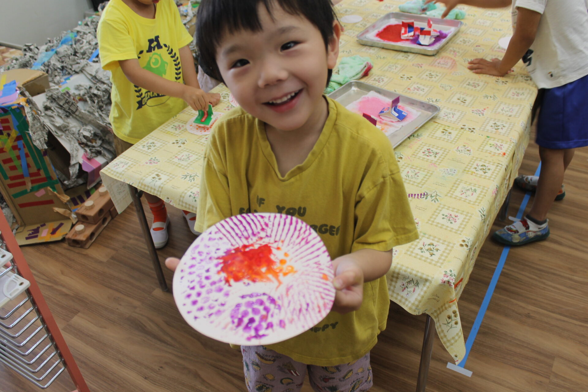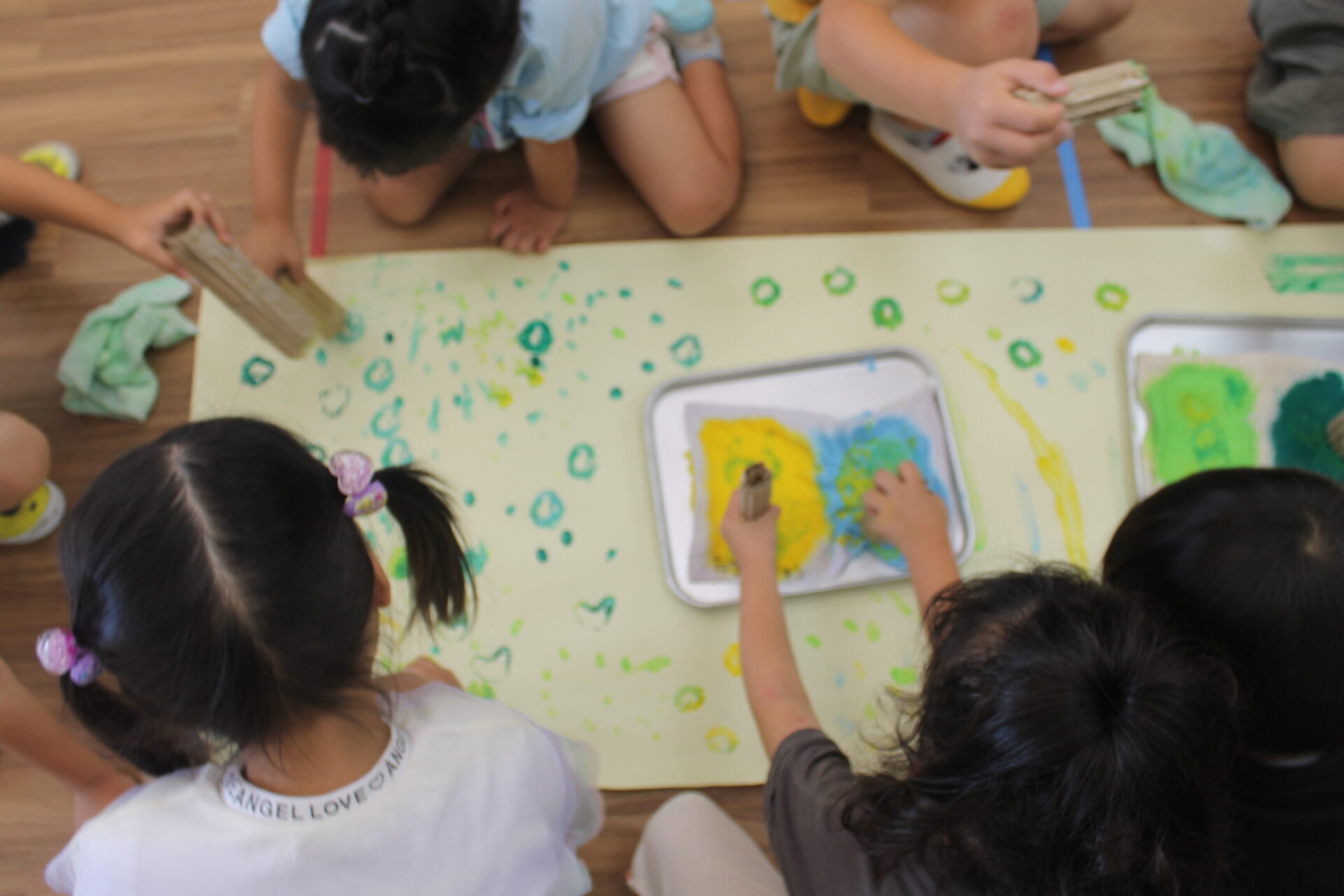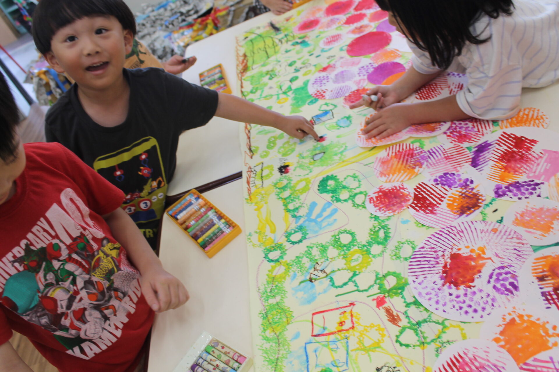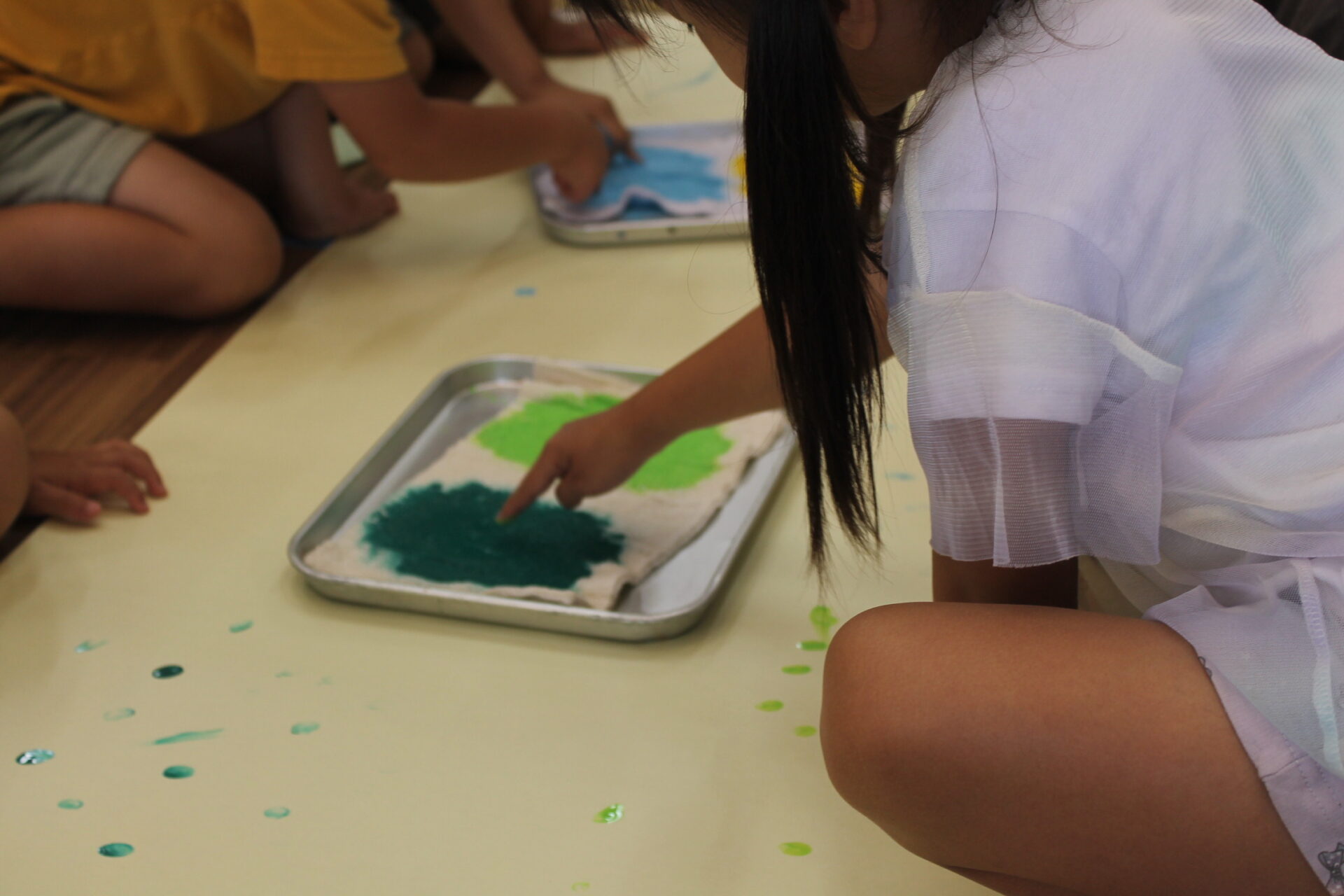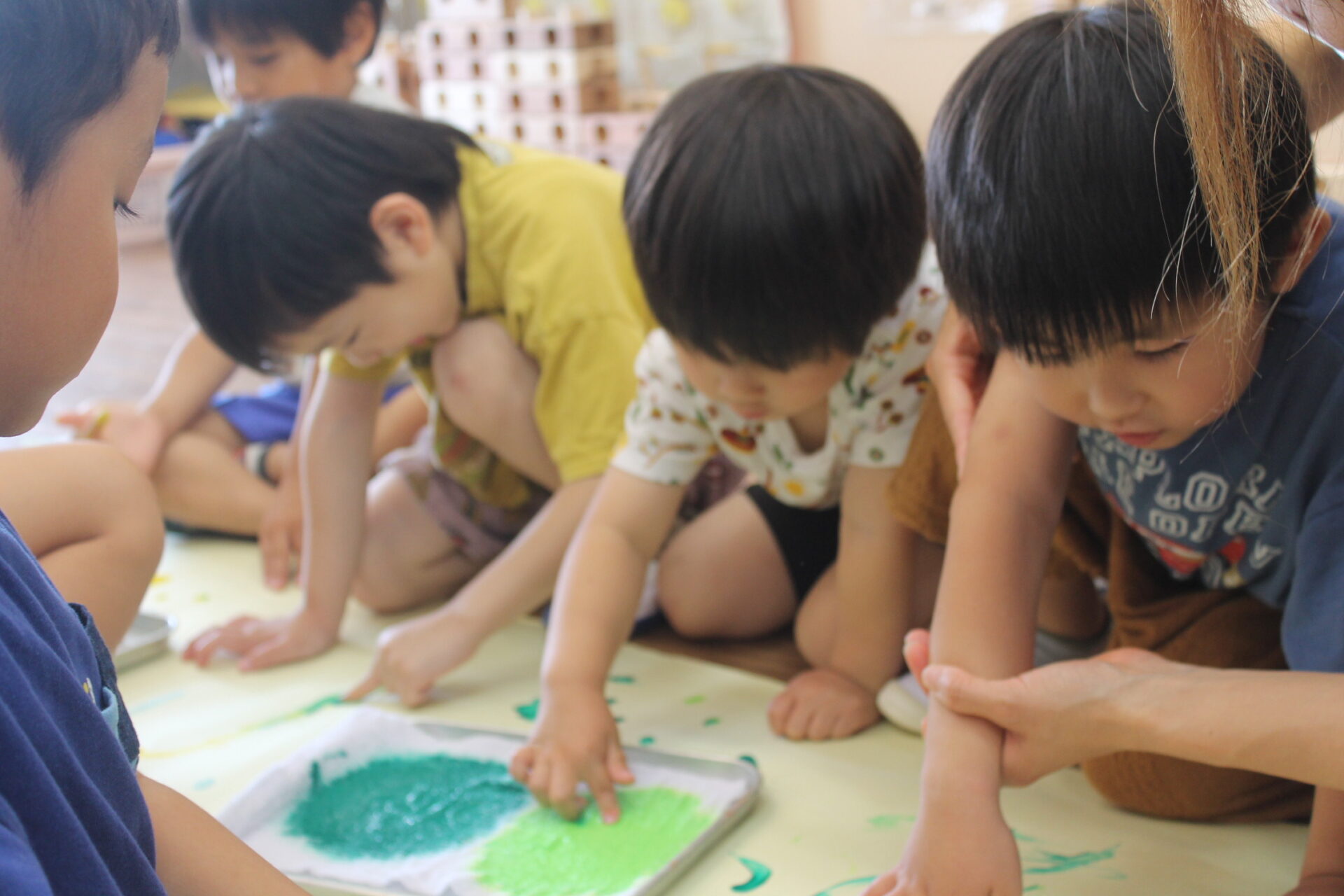 絵の具にそーっと指を置き、大きな紙にペタペタと色をつけていきます。