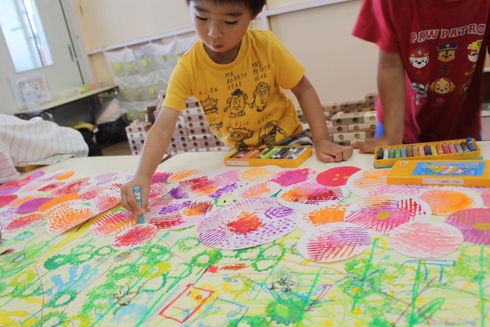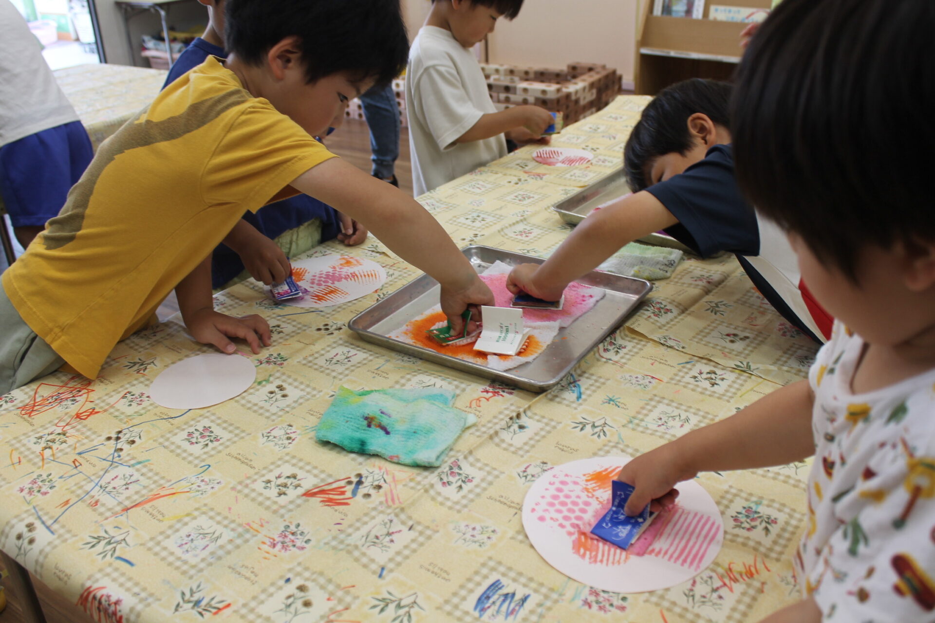 その後、ダンボールで色を付けていくと、色が混ざり合って紙いっぱいに綺麗な模様が広がりました。
