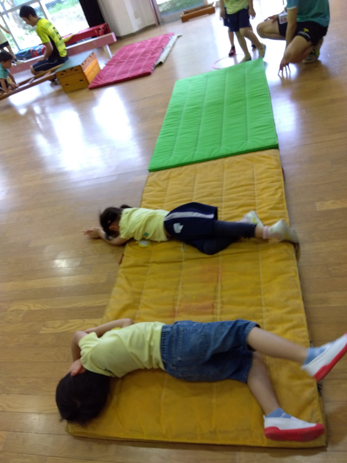 マットの上での横転は見てると簡単そうなのですが、実際にやってみると真っすぐに進むのが難しく、”斜めに転がらないようにするにはどうしたらいいかな…”と考えながら挑戦しています。