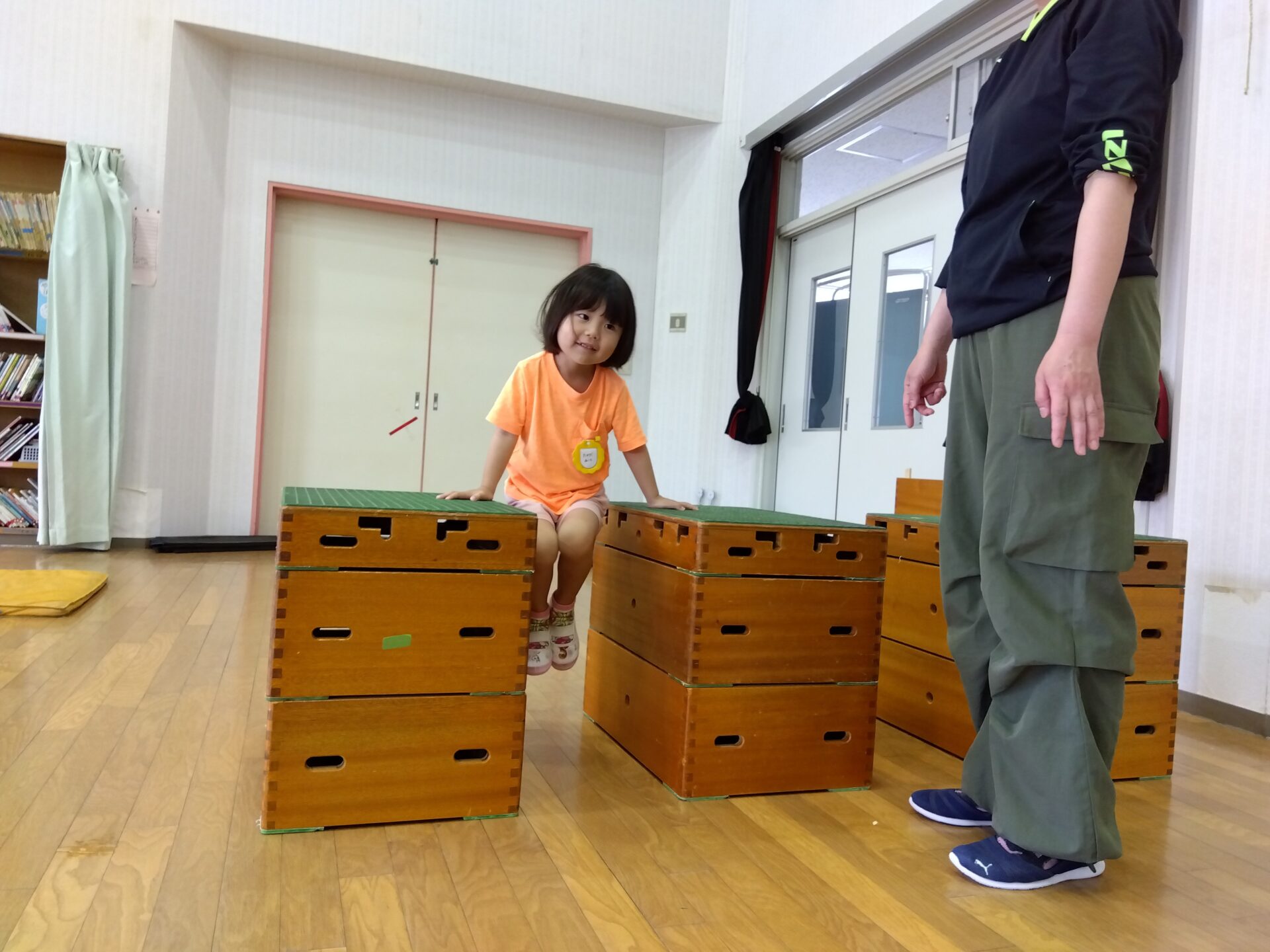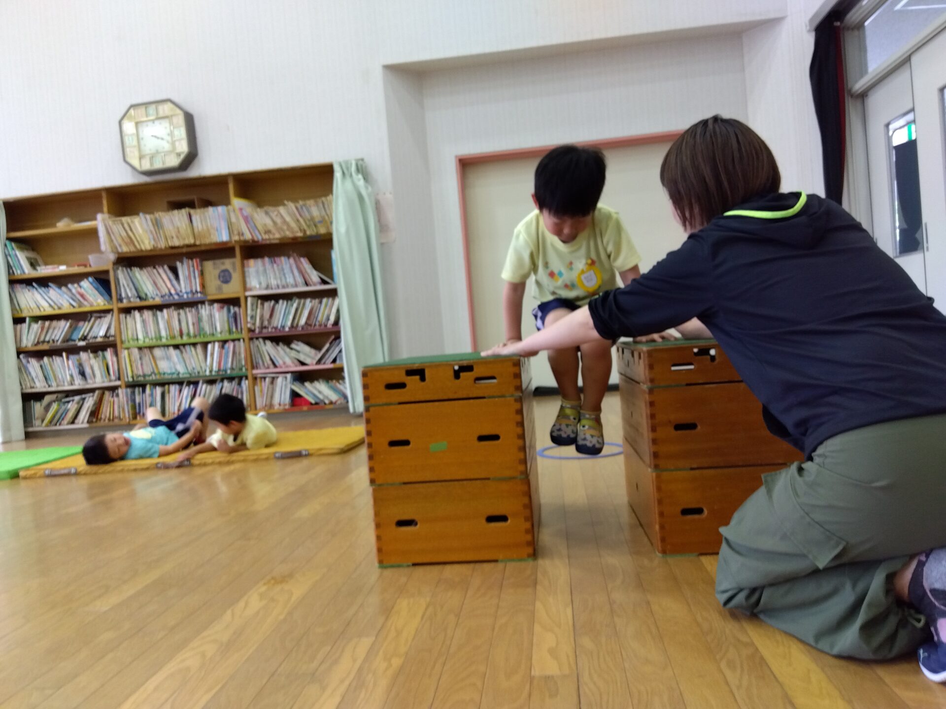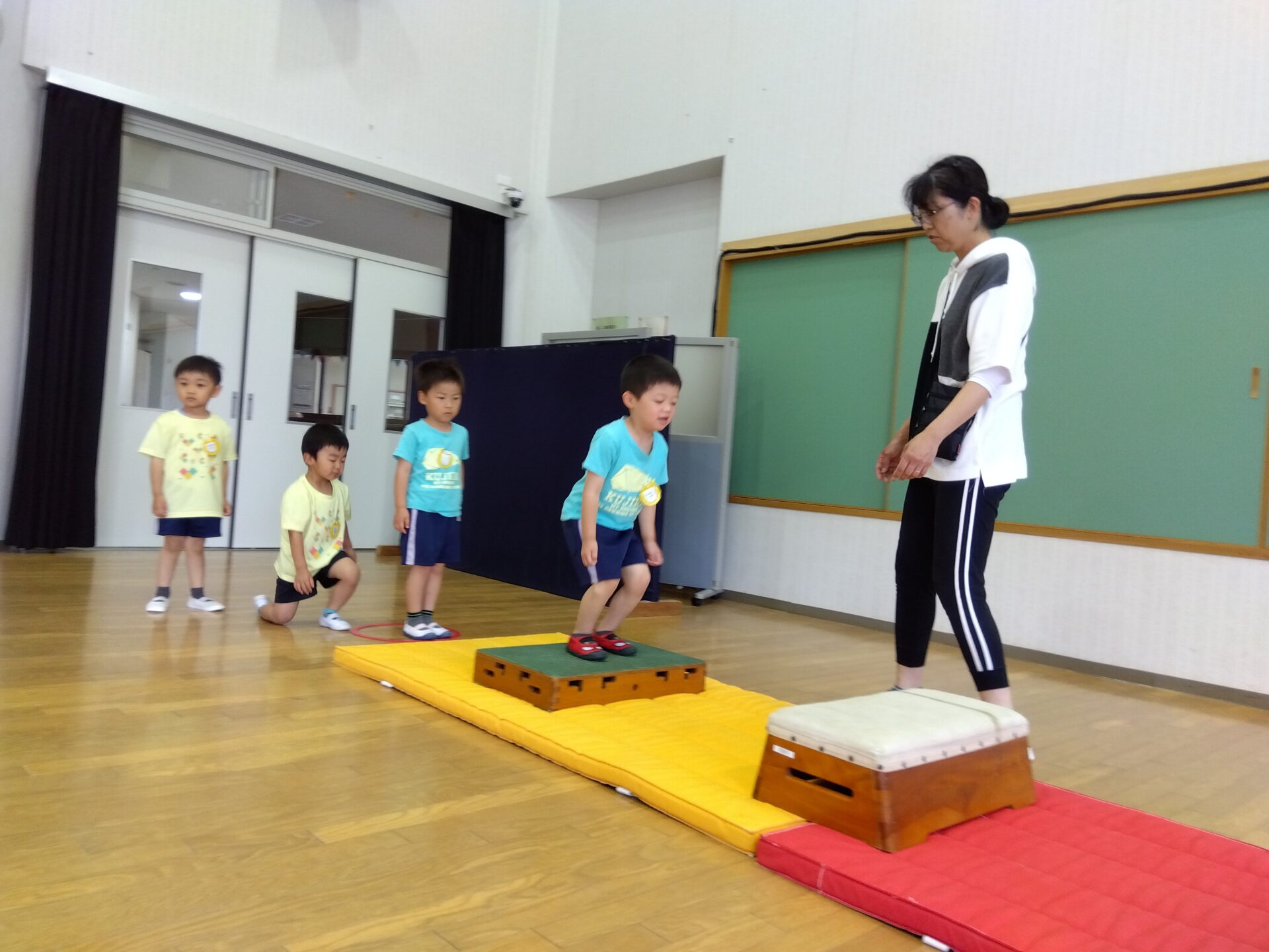 低い巧技台を両足を揃えてジャンプをしたり、