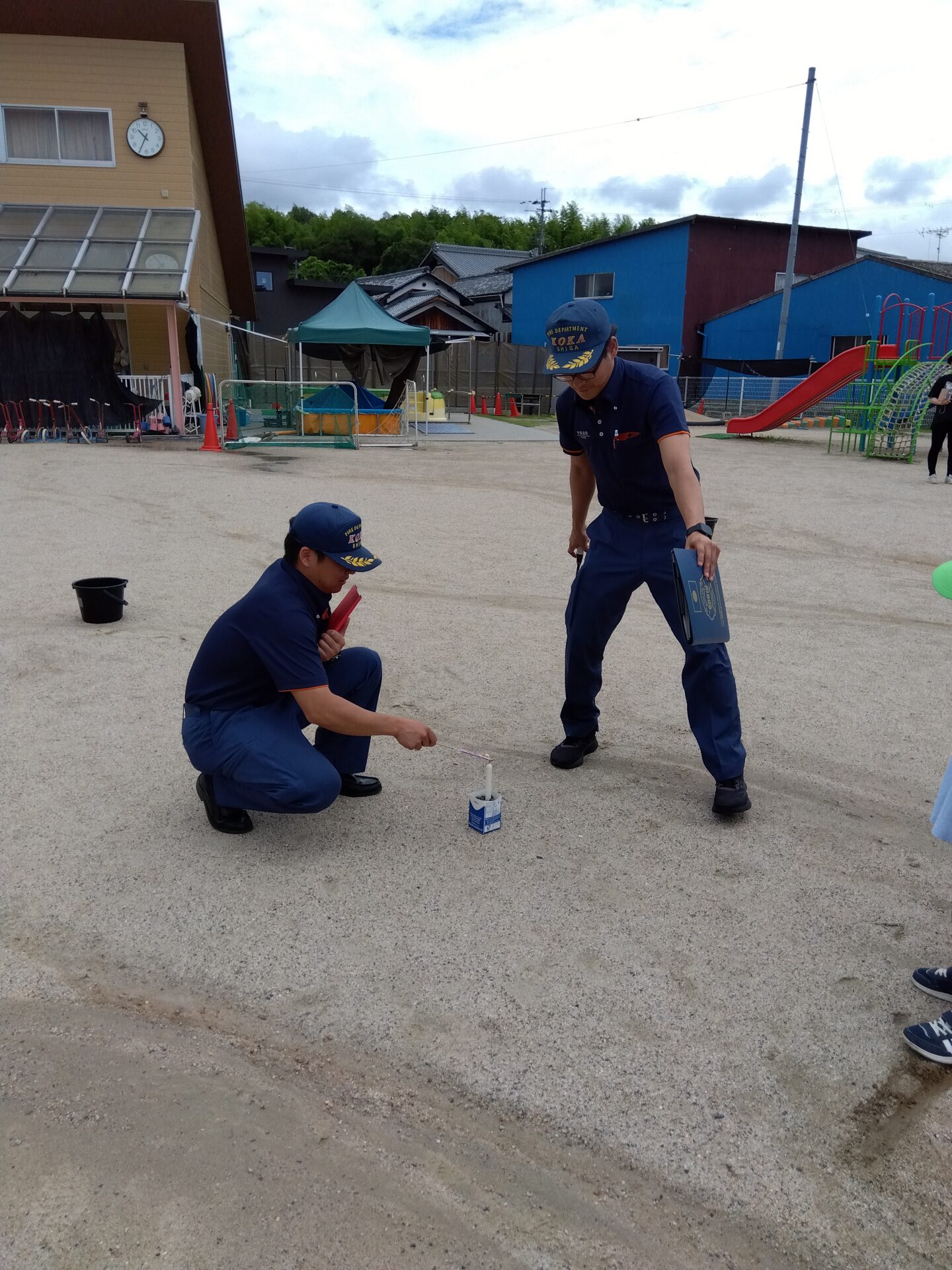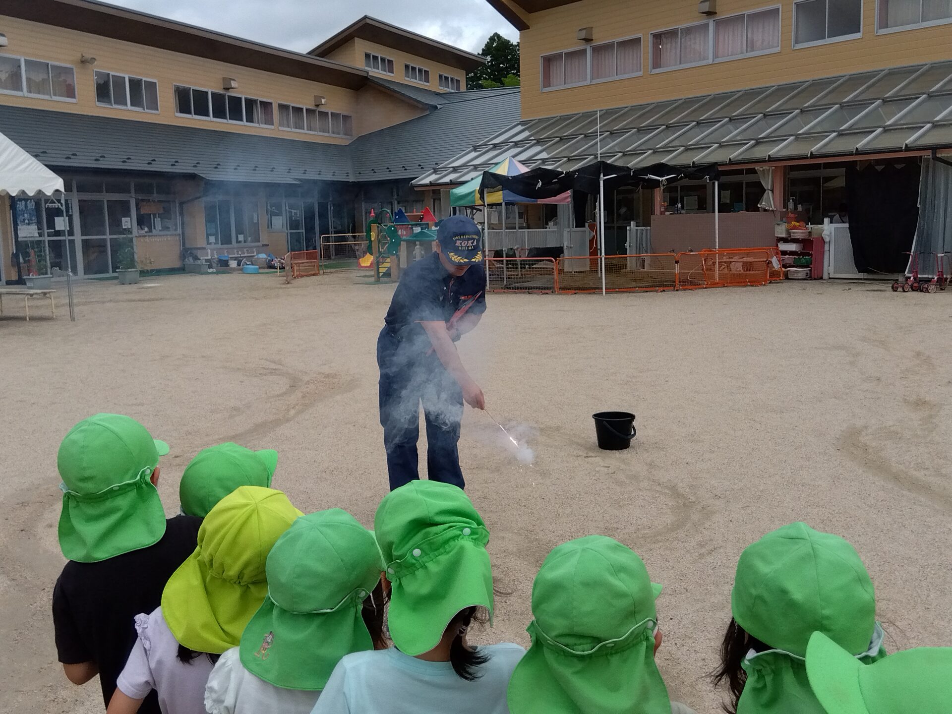 2025.06.26 ブログ 花火指導(5歳児)がありました 消防士さんから花火をするときに気をつけることを教えてもらいました 園庭で花火の遊び方の見本を見せてくれています。 消防士さんが見守る中 5歳児の子どもたちも1人1本花火を持って、火をつけるところから挑戦しました。「きれい」「うわー」と喜ぶ子どもたちでした。 一覧へ戻る