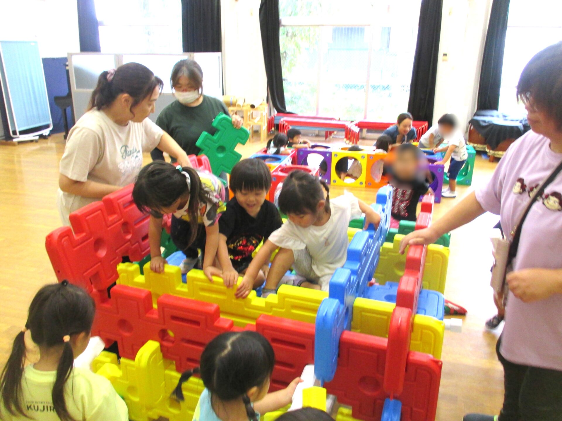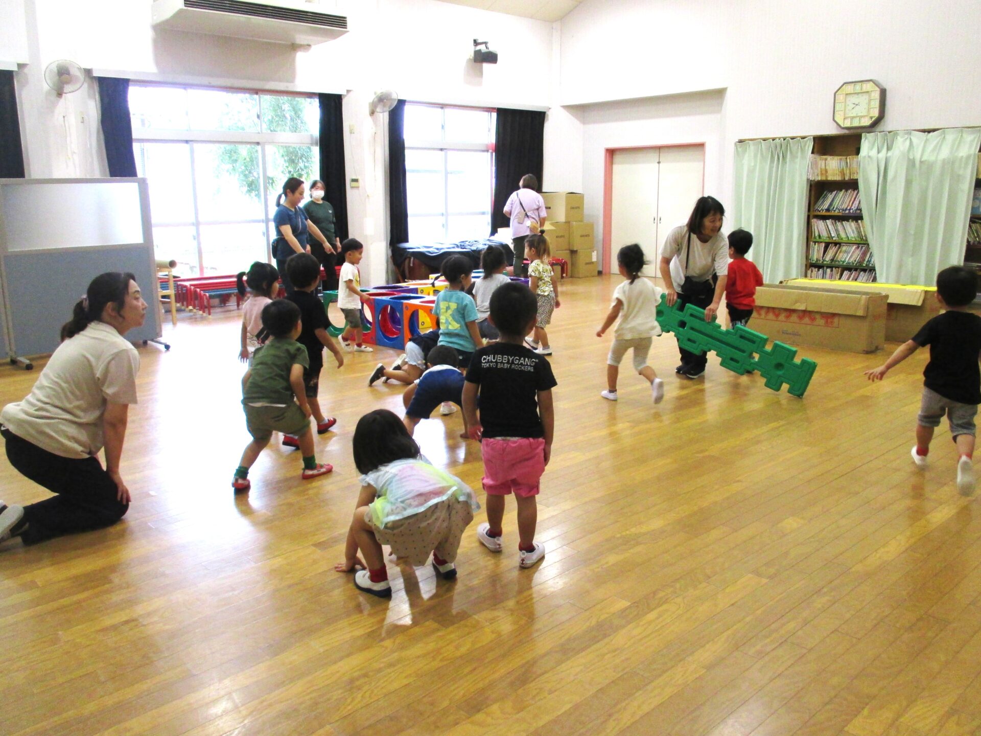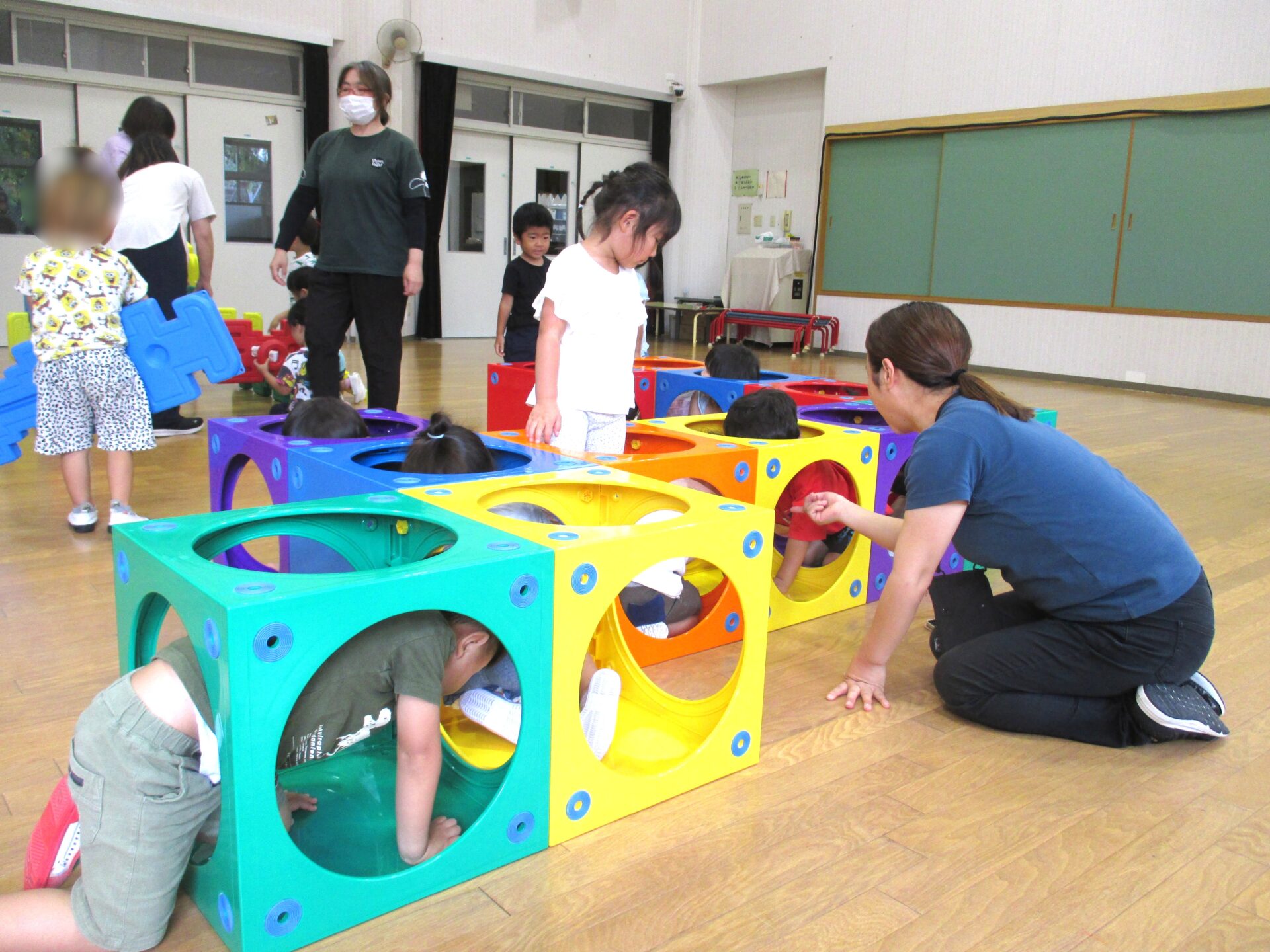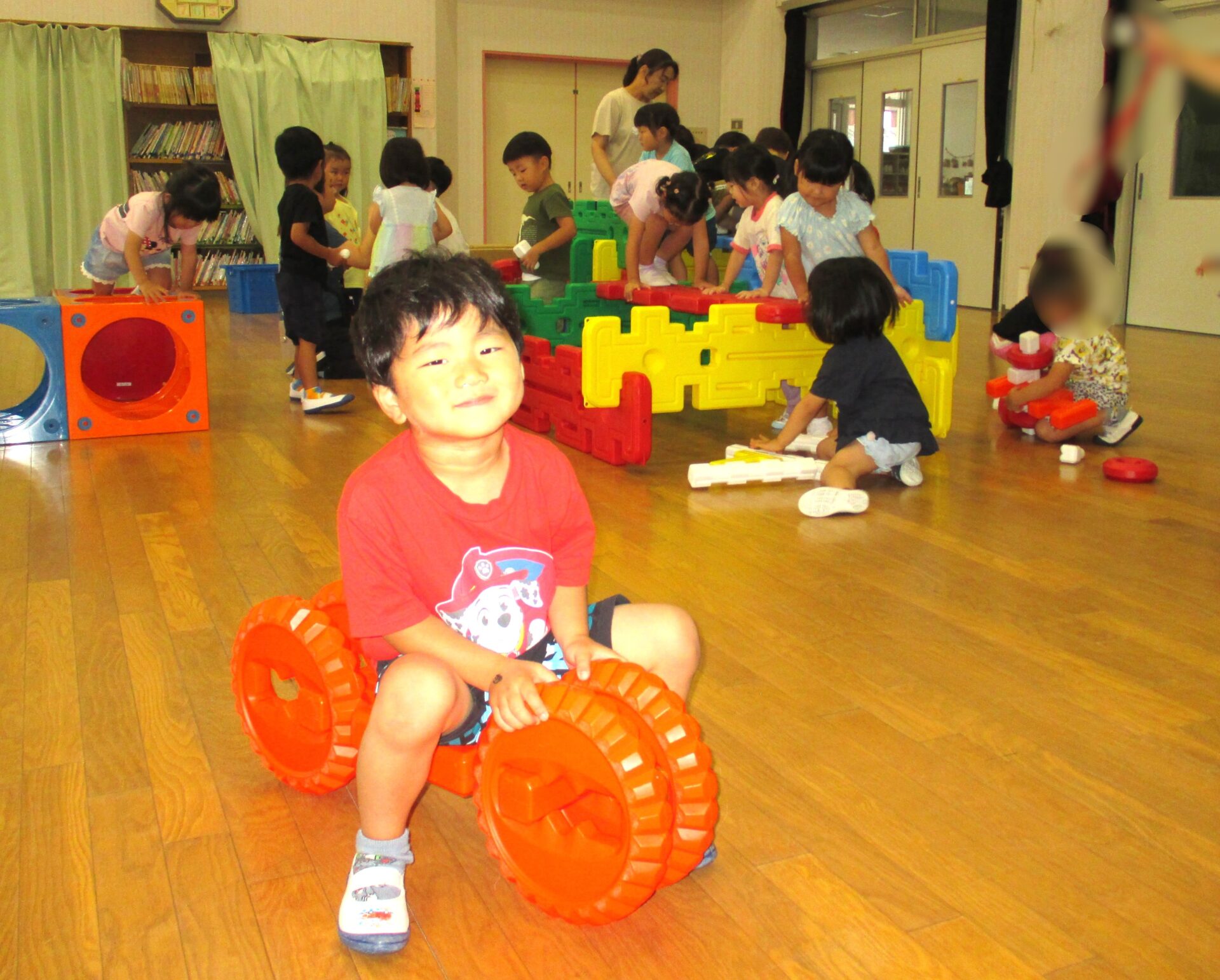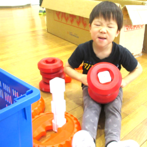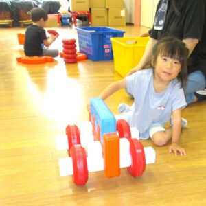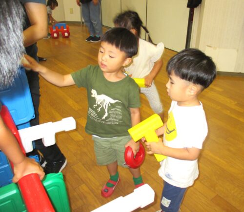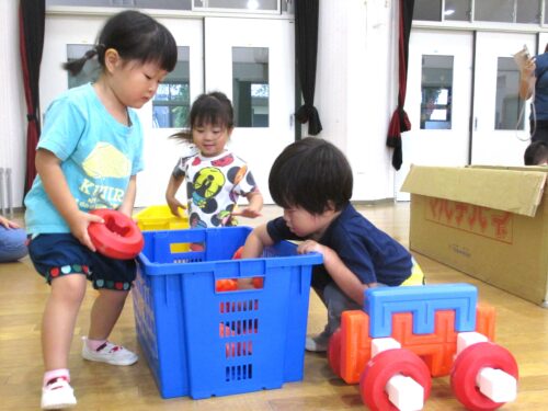 2025.08.08 ブログ なにしているのかな?② 「がちゃがちゃどんどん」楽しそうな音が遊戯室から聞こえてきました!! ゲームボックスのトンネル 時々顔を上げて周りを確認(^^) マルチパネ・エイトブロックを使って“コンコン” “カンカン” 「したからも入れるよ」「みててね」 丸い形を棒に通してタイヤを作って車が出来上がりました!! 出来上がったお家にのぼったり、座ったり、違うところから降りたりと繰り返し楽しむ3歳児さんでした。みんなで協力していい物が出来たね!! 一覧へ戻る