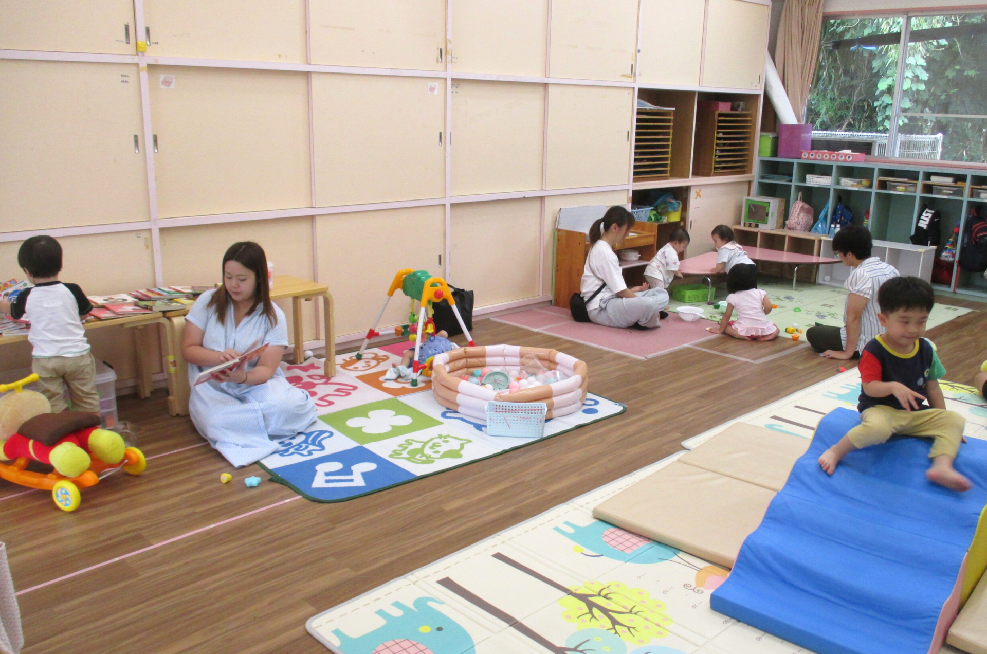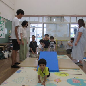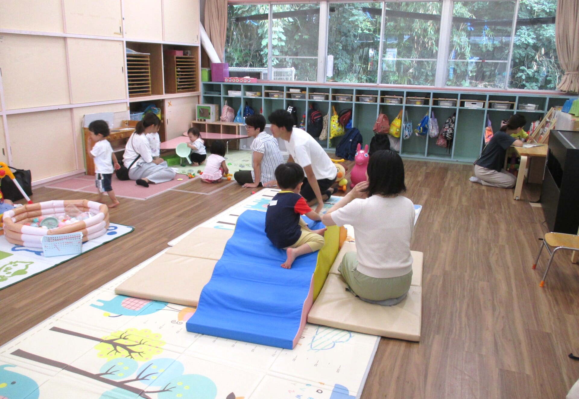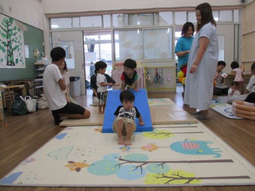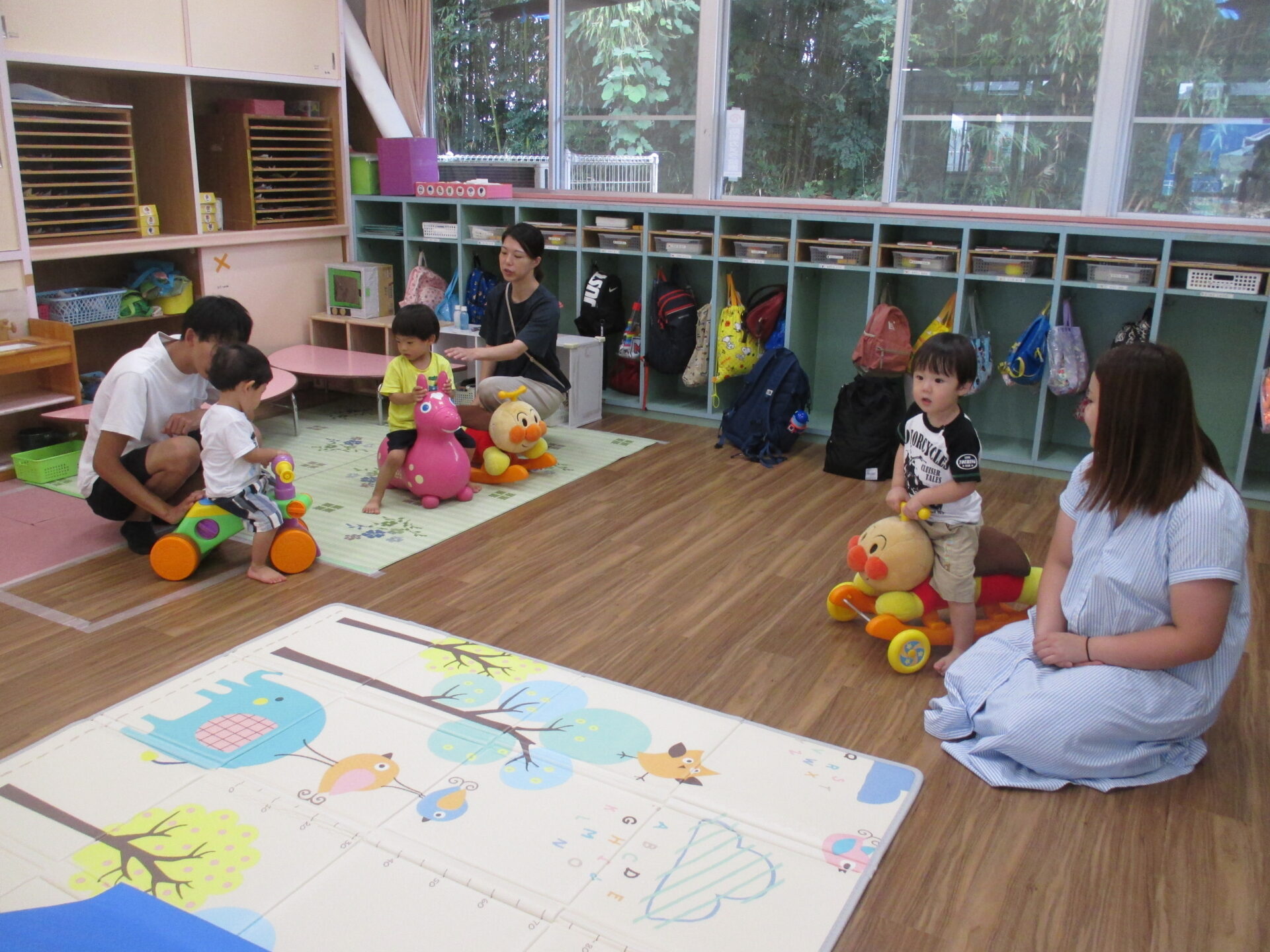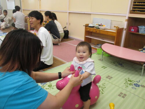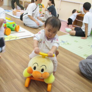 のびのびくじら8月は水遊びの予定でしたが、雨降りの日になってしまい、今回は室内遊びをしました。運動遊具やライダーに乗って身体を動かして遊ぶ姿やままごと遊び・手作り玩具やボール落とし・ボールプールに入って遊ぶなど好きな遊びを楽しむ姿が見られました。