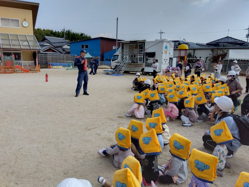 毎月、避難訓練をしています。今回は消防署の方に来ていただき、職員の通報訓練やこどもたちの避難する様子を見ていただきました。