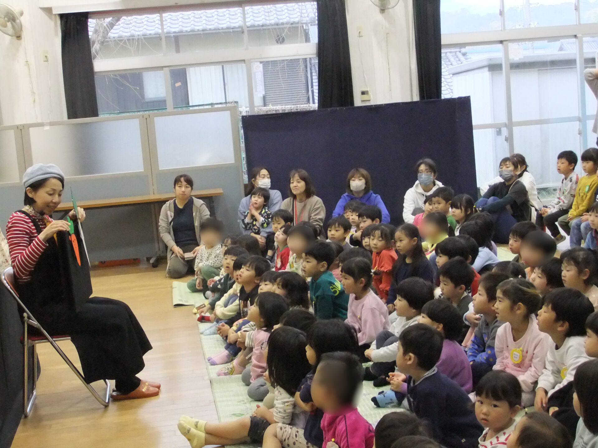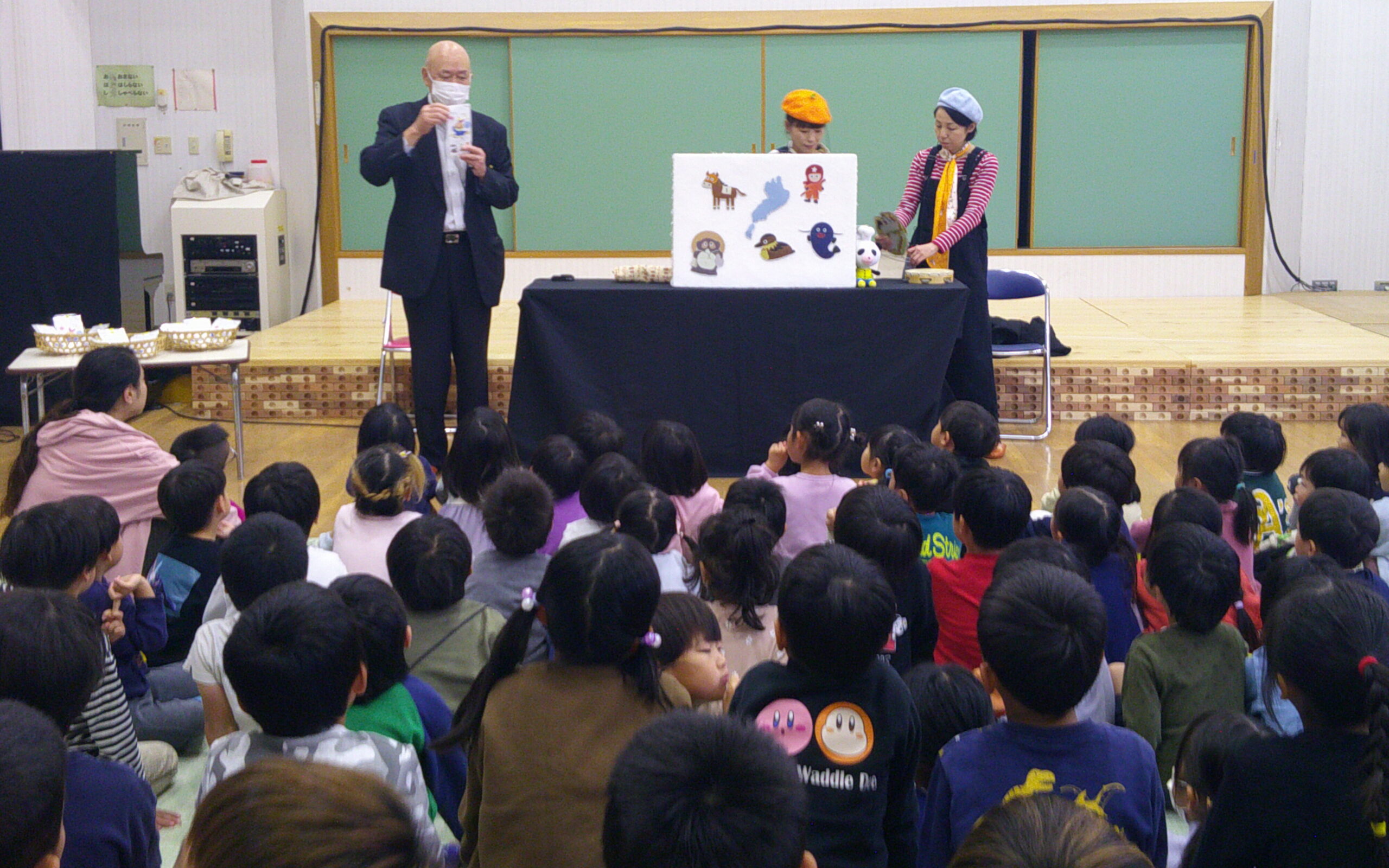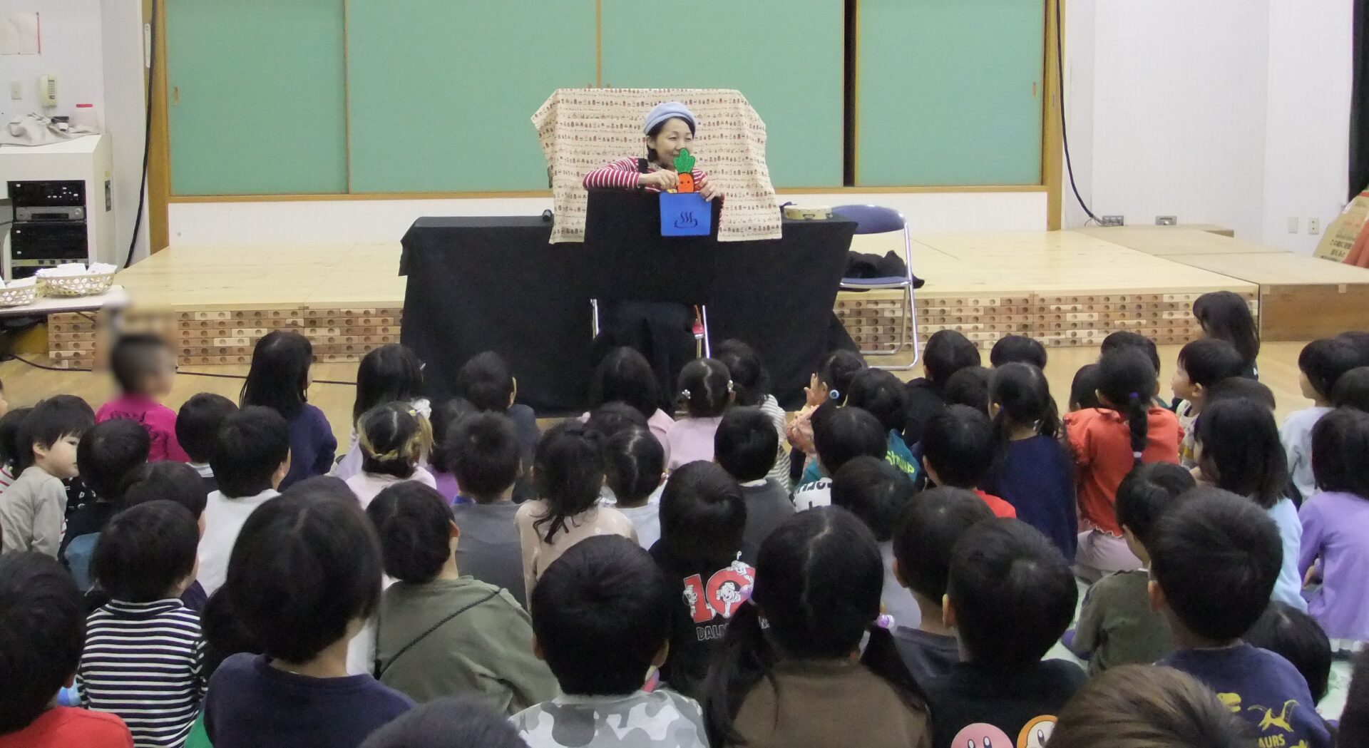 登場する人形に興味津々で見たり、なぞなぞの問題を考えたり、答えたりしながらお話の世界を楽しむことが出来ました。楽しい時間はあっという間。最後に、シールを一人ひとりに、園に3冊の絵本をお土産にいただき、“ありがとう”の拍手をしてお別れです。これからもお話の世界楽しんでいきたいです。