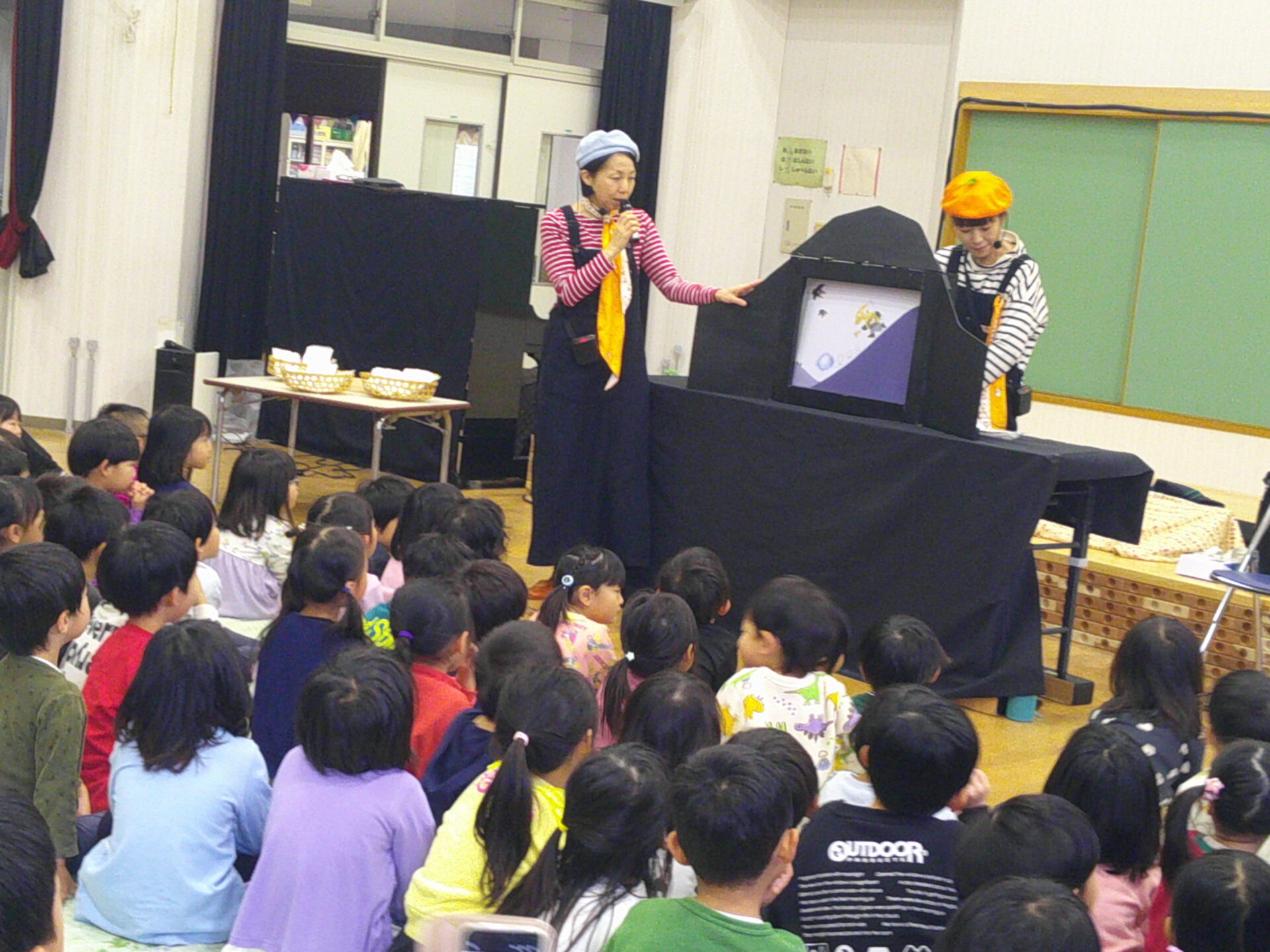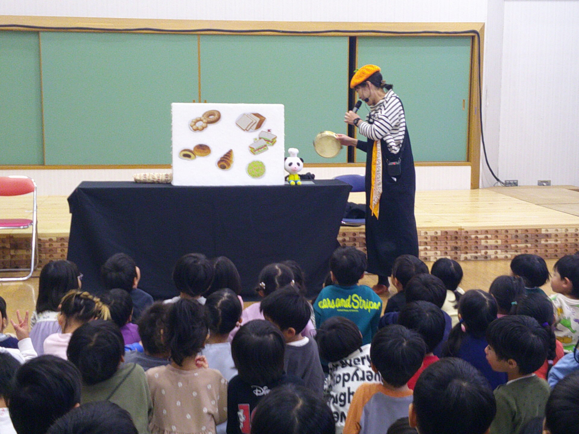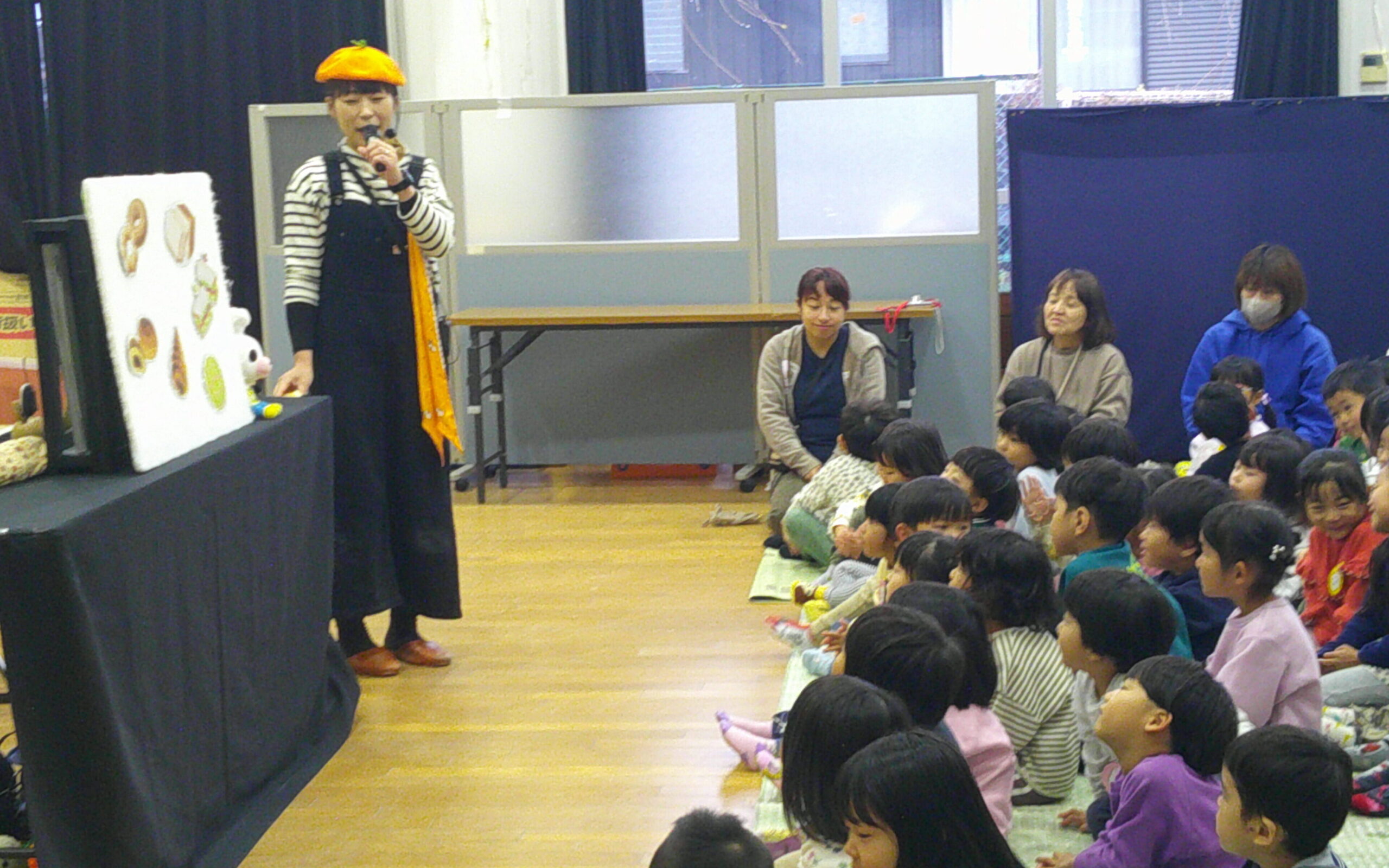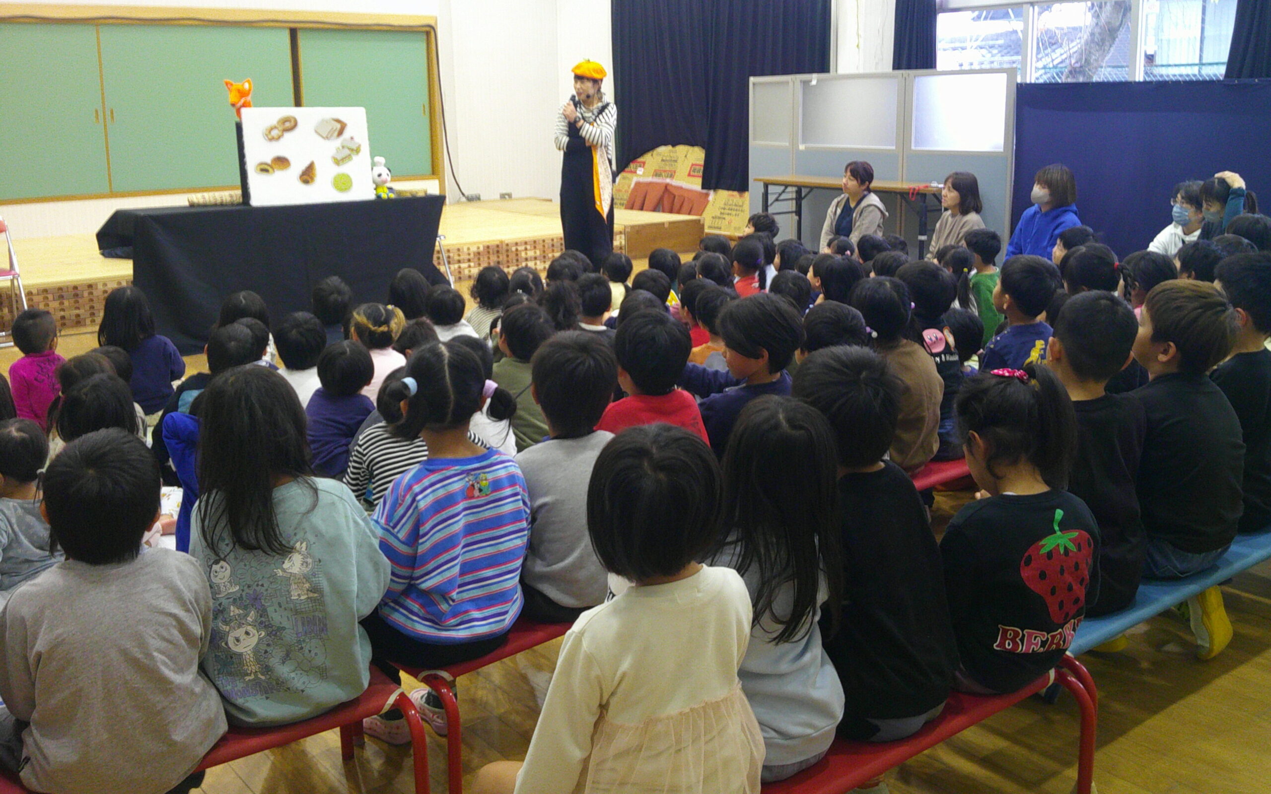 登場する人形に興味津々で見たり、なぞなぞの問題を考えたり、答えたりしながらお話の世界を楽しむことが出来ました。楽しい時間はあっという間。最後に、シールを一人ひとりに、園に3冊の絵本をお土産にいただき、“ありがとう”の拍手をしてお別れです。これからもお話の世界楽しんでいきたいです。