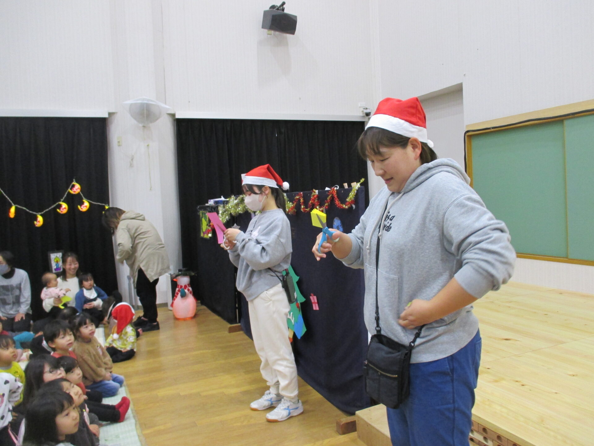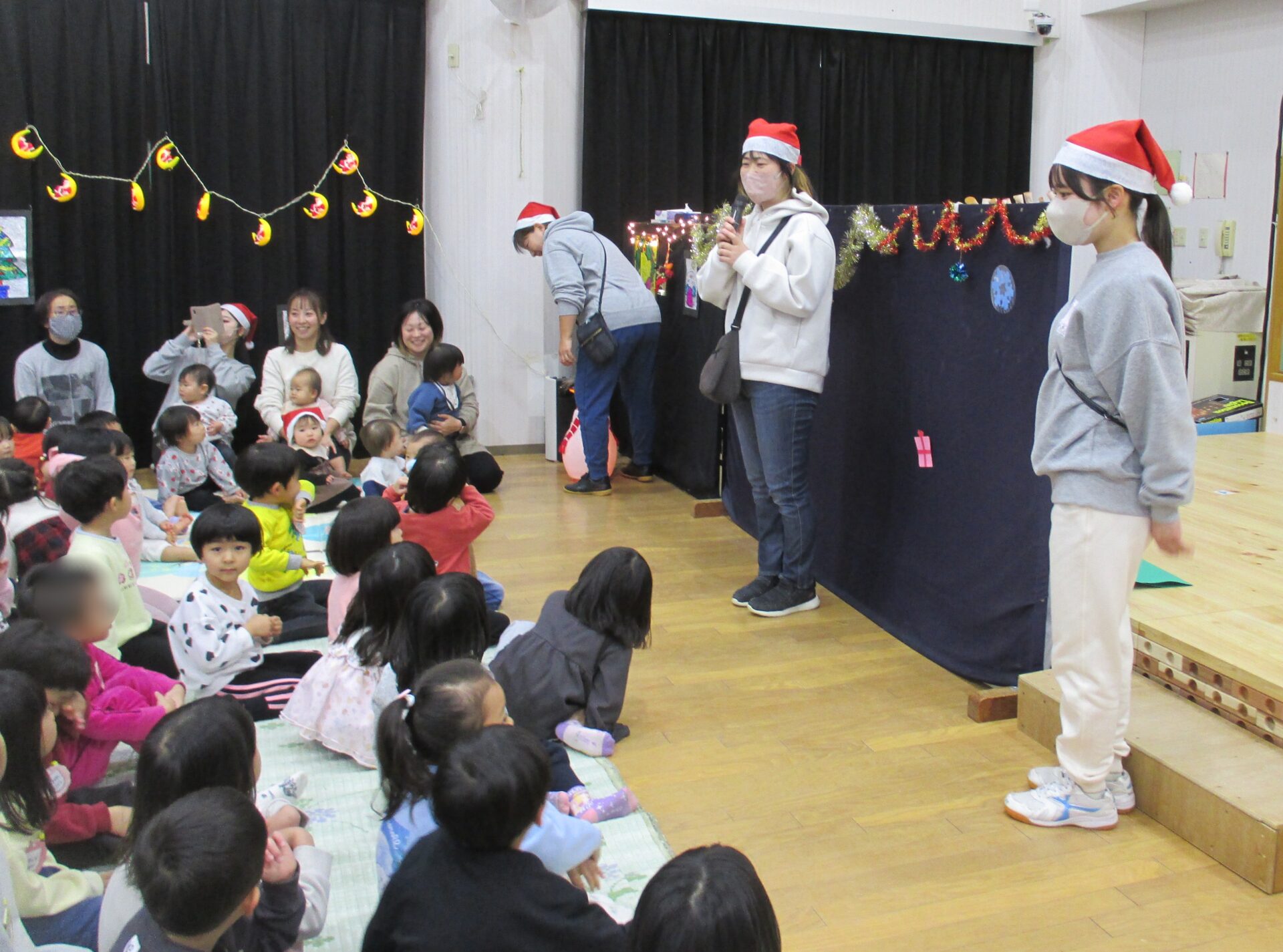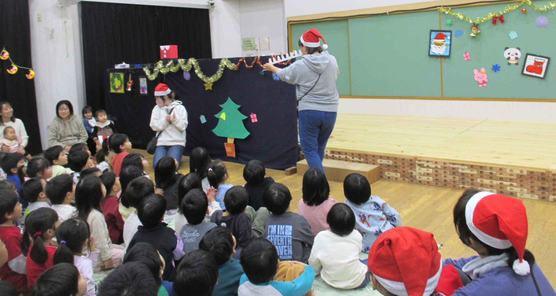クリスマス前に菩提寺くじらこども園でお楽しみ会がありました。遊戯室にこどもたちがわくわくドキドキで集まってきます。どんな楽しいことが待っているのでしょうか・・・
