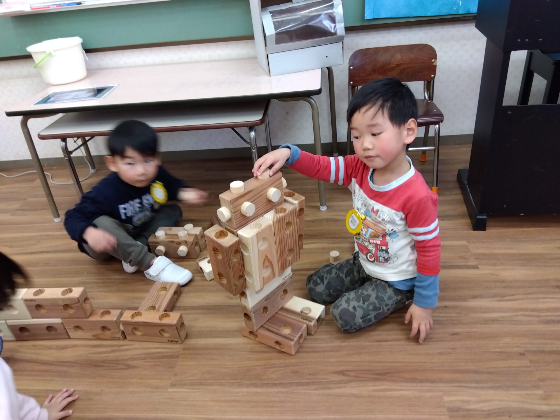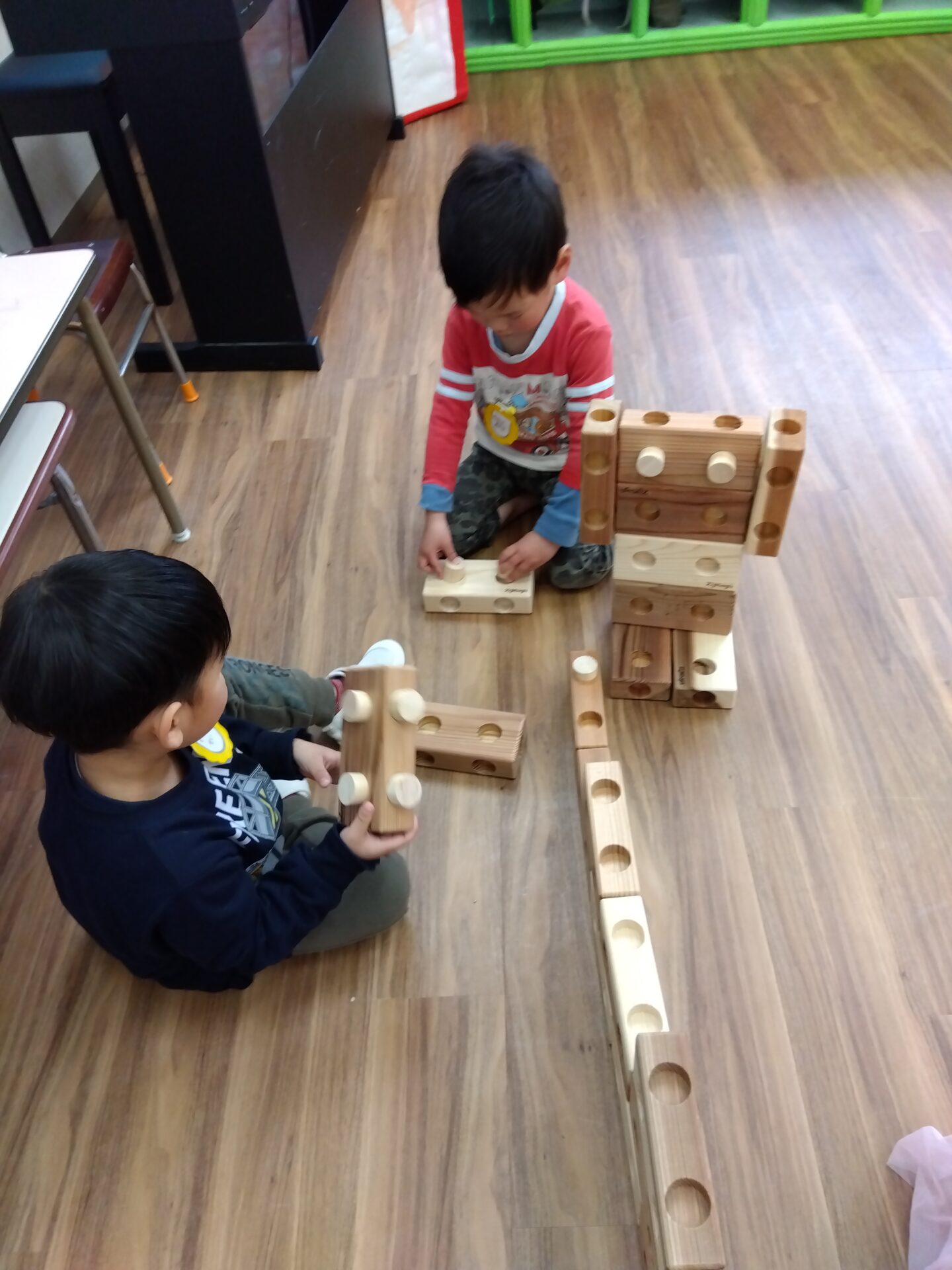 はじめてズレンガで遊びました!!「ズレンガって何?」積み木だけど…大切な小さな積み木をつかって、積み重ねるとズレなくなるんだよ!と話をしてから遊び始めました。